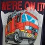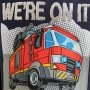 Mooi LEGO City donkerblauw T-shirt met lange mouwen met print van een brandweerwagen op de voorkant. Coole flip-paillettendecoratie van de tekst "We're on it!", Die van kleur verandert wanneer u uw hand over de pailletten veegt. Het t-shirt is gemaakt van comfortabel materiaal met rib bij de halsopening.