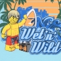 Cool licht turquoise LEGO T-shirt met korte mouwen. Op de voorzijde staat een opdruk van een LEGO surfer minifiguur in een surf omgeving en de tekst: 'Wet 'n' Wild'. De achterzijde is effen.