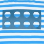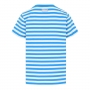 Mooi lichtblauw-wit gestreept LEGO T-shirt met korte mouwen. Op de voorzijde staat een opdruk van een donkerblauw LEGO 2x4 steentje. Op de achterzijde is aan de bovenkant subtiel een LEGO steentje ingeborduurd.