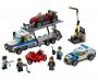 Volop boevenjacht-actie gegarandeerd als de LEGO City politie de auto van de boeven in beslag neemt. Inclusief autotransport-vrachtwagen met twee verstelbare niveaus, hellingbanen, politieauto en de motor met zijspan van de boeven, plus een verstelbare wegversperring met lantaarnpaal. Inclusief vier minifiguren.