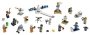 • Accessoire-elementen: een vergrootglas, een lasapparaat, een witte vlag, een megafoon, een camera, een microfoon, het hoofd van een alien op een stok, 2 astronauthelmen met blauw vizier, een astronautenhelm met goudkleurig vizier, een pak voor ruimtewandelingen met goudkleurig vizier en lamp, een vuilnisbak, een mok, een afstandsbediening voor een drone, pizzadozen, een pizza, 2 geodes die nieuw zijn vanaf juni 2019 en een gereedschapskist.