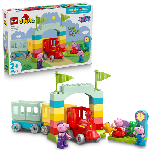 • Inclusief figuren van Opa Big, George Big en Peppa Big, een duwbare speelgoedtrein met wagons, een boog van stenen en een LEGO DUPLO station met een klok
