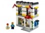 • De winkel heeft een gedetailleerde gevel met een doorzichtige deur die open kan, 3 ramen, 3 vlaggen en een LEGO uithangbord, plus een gedetailleerd interieur met een 'Kies & bouw'-muur, een 'Bouw een minifiguur'-display, rekken gevuld met LEGO dozen en een toonbank met kassa.