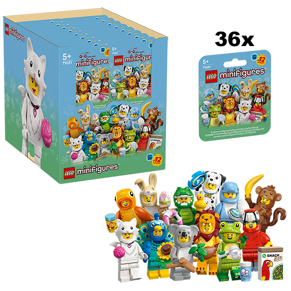 Een volle ongeopende doos LEGO 71051 Minifiguren Serie 28 Dierenkostuums met 36 doosjes!