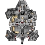 • Aan de buitenkant van dit LEGO Star Wars Millennium Falcon model vind je draaiende geschutskoepels boven en onder (in de onderste kunnen 2 minifiguren), 2 wapens met veermechanisme, een laadklep die omlaag kan worden gebracht en een cockpit met ruimte voor 2 minifiguren.